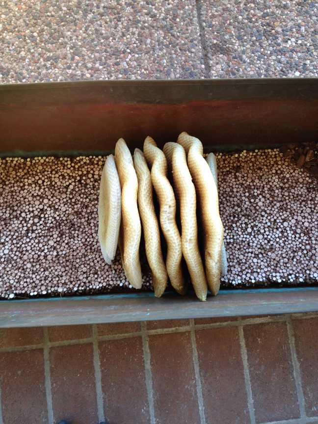 A couple of weeks ago I went out to the site to meet up with SREP who had gone to the expense of renting a lift so that I could get up to the 3rd floor planter and remove the bees. Once I was lifted up to the planter to begin the removal process I discovered the bees had absconded their hive. After removing the planters to get to the empty comb it looks as if these bees left due to lack of food stores. The comb was beautiful and the bees had attached it to the underside of the planter boxes in the void underneath the planters.