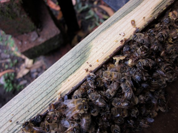 As for the pics above and below, an unfortunate sight. One of our favorite backyard colonies – dead. Definitely not Colony collapse disorder but the effects of Varroa destructor – mites. This past Fall, we confirmed that several of our fellow bee keepers around the East Bay got hit pretty hard by mites. Something we all watch for. It is preventable but not always caught in time.