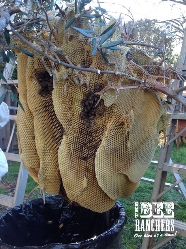 Luckily the owners who had been remodeling this house for over a year were not bothered by the natural beehive that had developed in the olive tree of their backyard. They were however not keen on keeping it there once they moved in. Thankfully they were smart enough to call a friend of Mike’s to inquire about removal/rescue option.